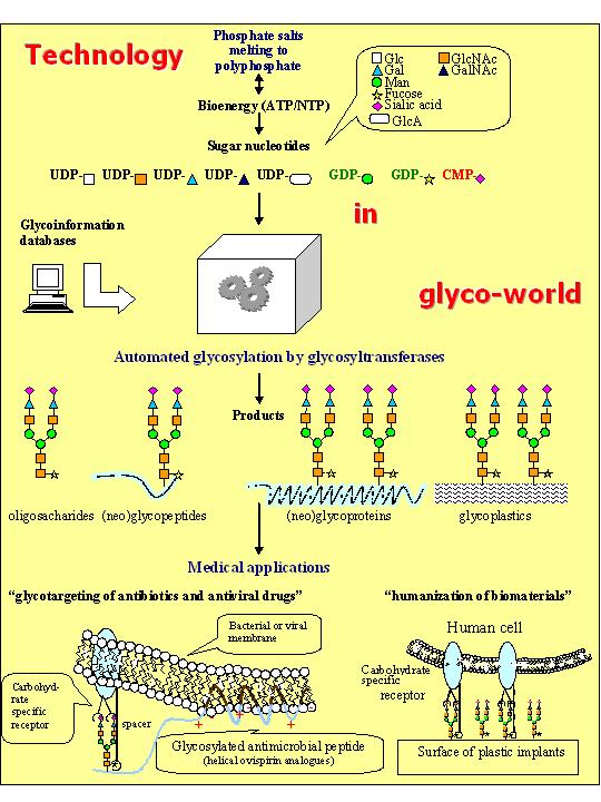 Glycobiotechnology. Schematic view on biocatalytic synthesis of various glycostructures and their proposed medical applications. From the top: high-energy phosphate bonds are formed at high temperatures, then they are transferred to nucleotides, subsequently the nucleotides are transferred to monosaccharides and finally the monosaccharides are transferred by glycosyltransferases to specific acceptors. Antimicrobial peptides, glycosylated in this way, could be used for targeting of bacterial or viral membranes. No less interesting is preparation of defined glycostructures on surface of plastic implants.